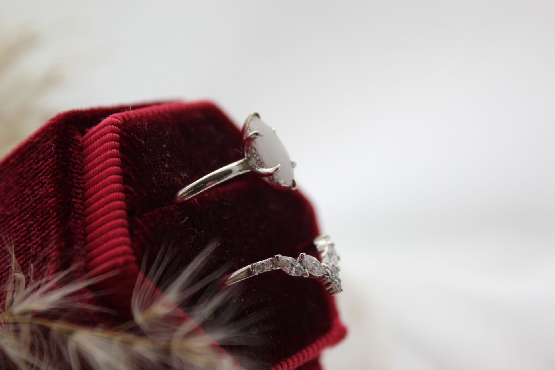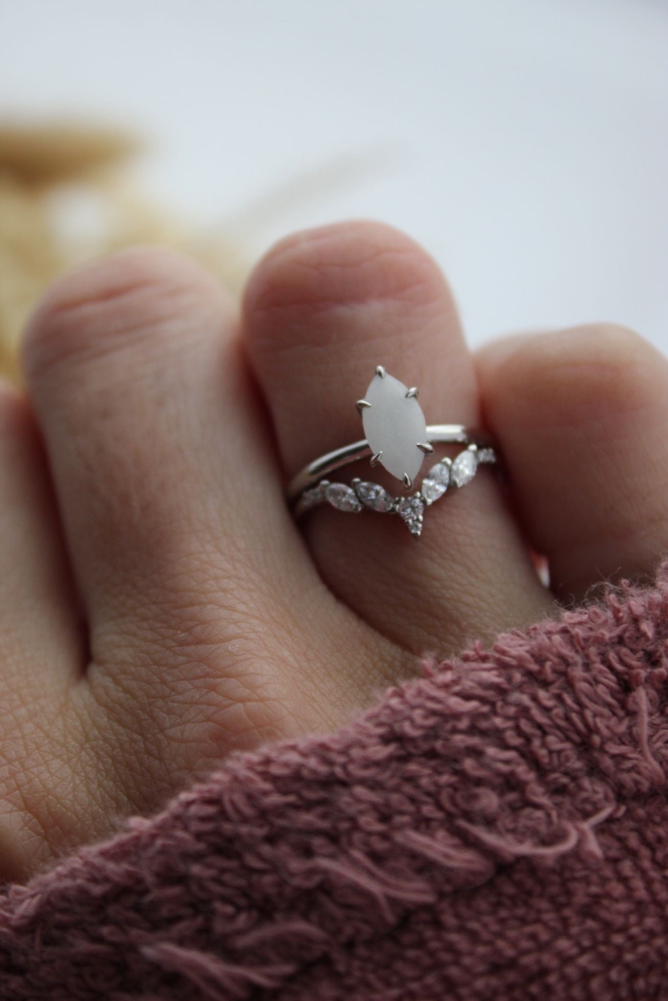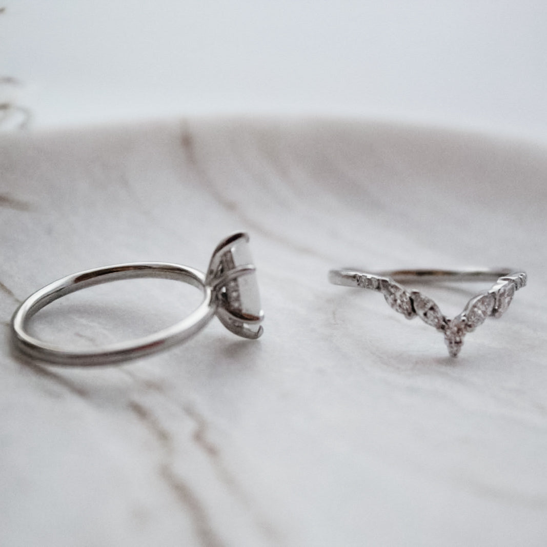 Elevate your style with the Harmony Stacking Set. Featuring a marquise 5x10 inclusion stone and a hidden halo customisable with your choice of stones. The second band boasts 5 2x4 marquise stones and 6 round stones, allowing for personalisation and versatility. Perfect for any occasion.