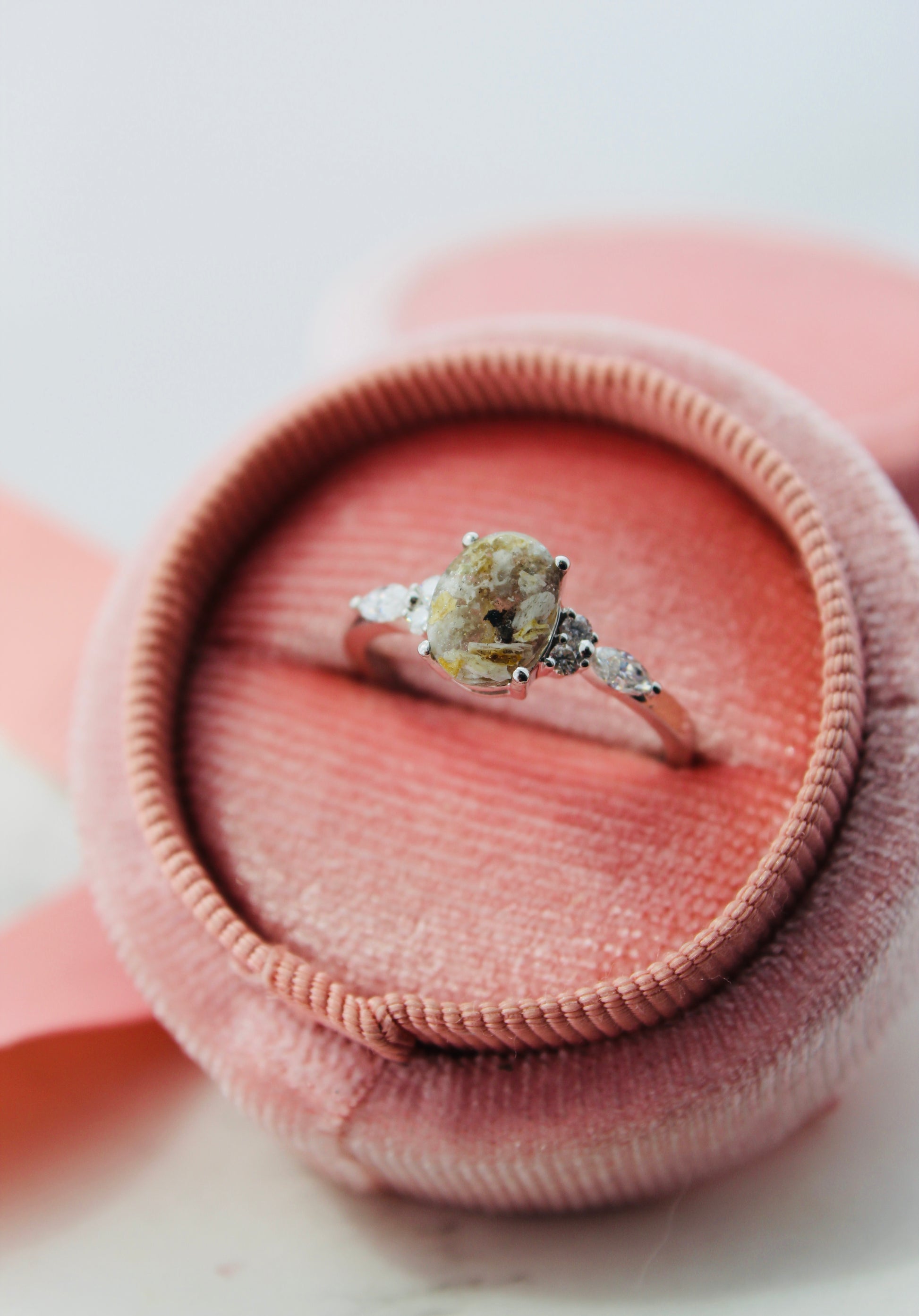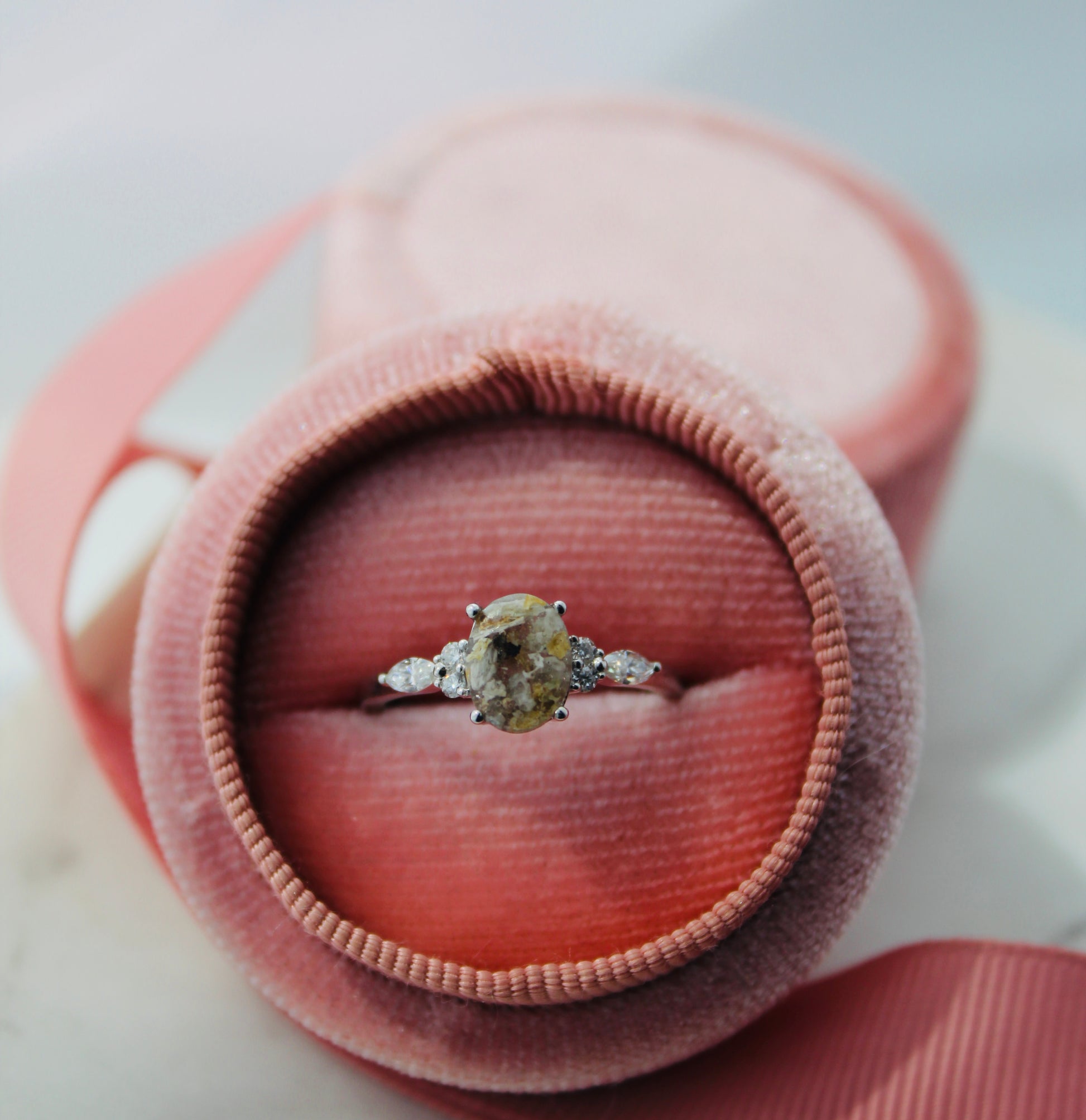 Personalise the central oval stone with your choice of inclusion, such as breastmilk, ashes, or umbilical cord, and customise the ring even further with birthstone accents.