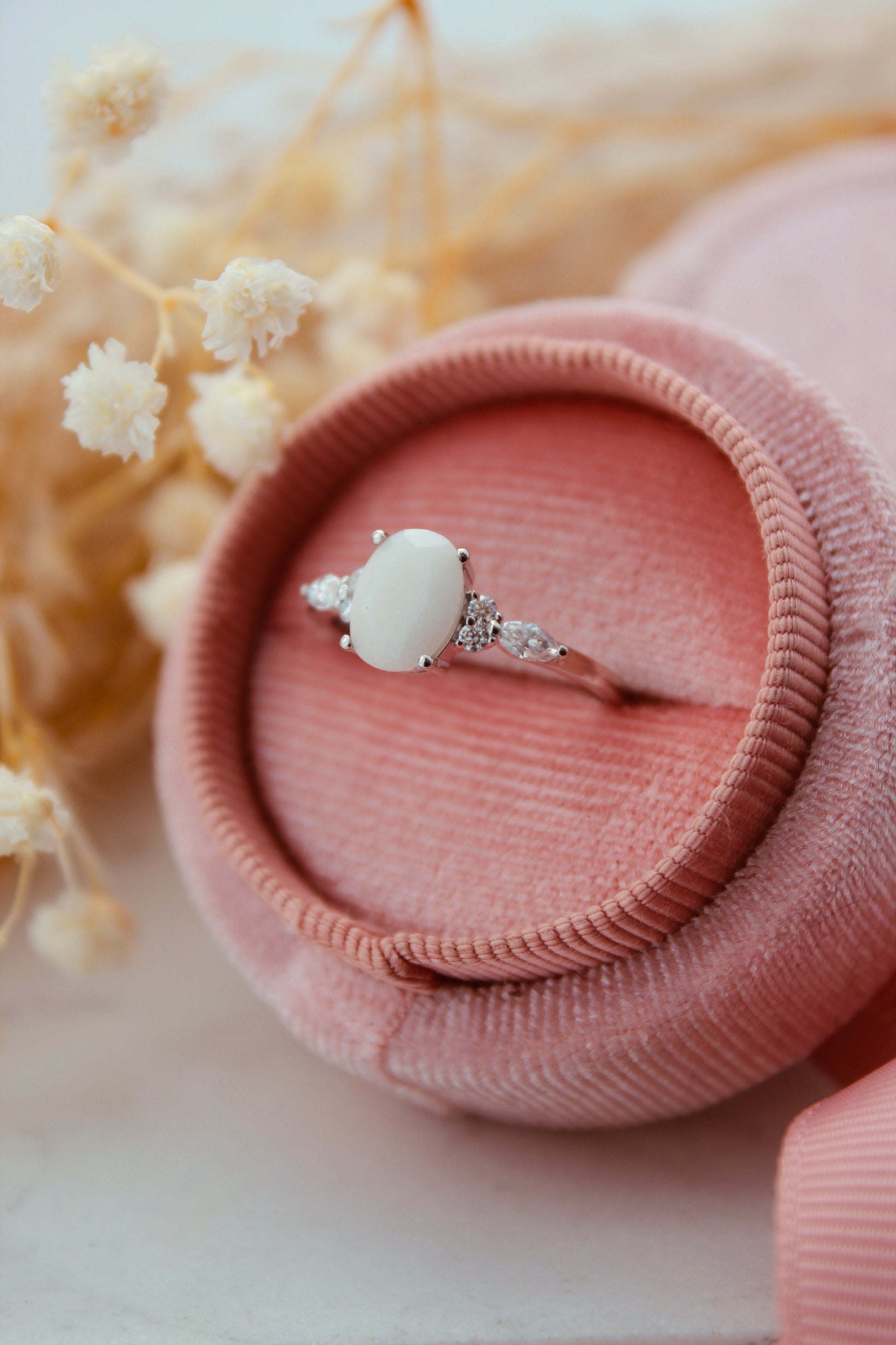 Discover our exquisite ring, featuring a stunning 8x6mm oval centre stone, flanked by two delicate 1.5mm stones and complemented by a 2x4mm marquise stone at each end.