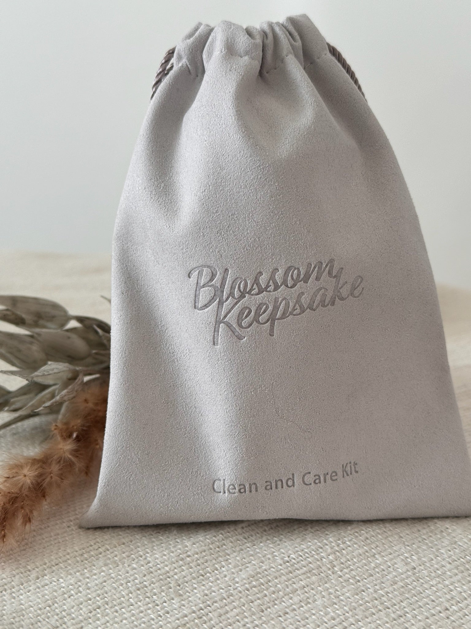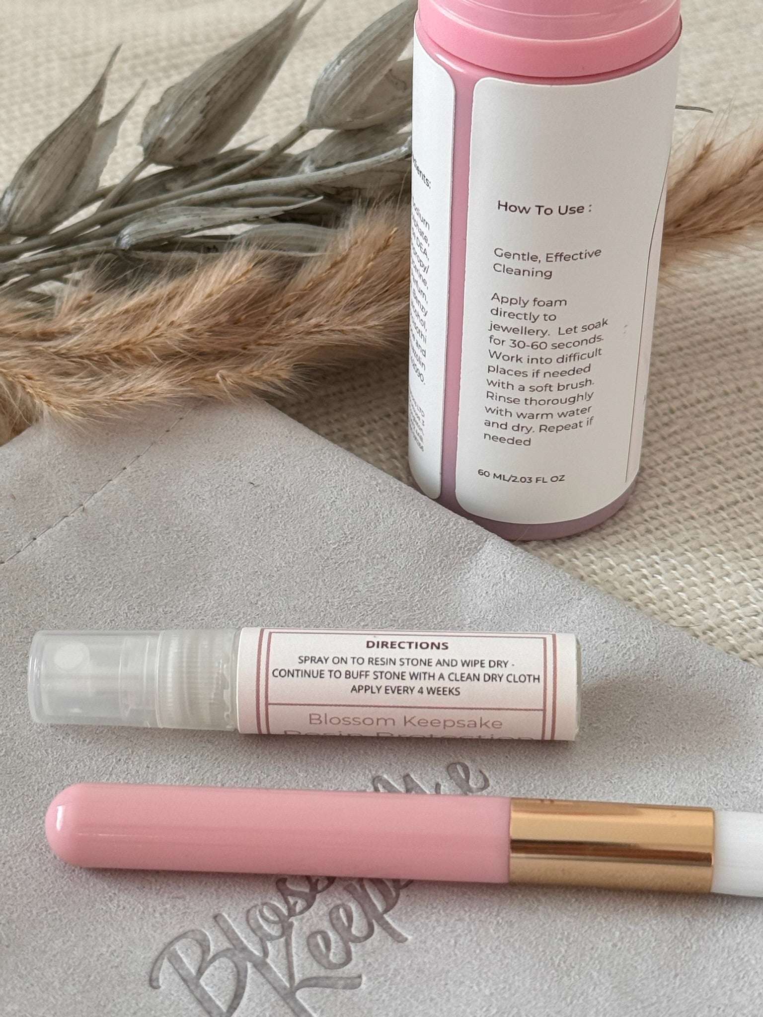 Expertly formulated by Blossom Keepsake, our Clean and Care kit is the perfect choice for maintaining your resin jewellery. This kit includes a gentle foam cleaner, protection formula, soft brush, and moleskin pouch for convenient storage. Keep your jewellery looking like new with monthly use.