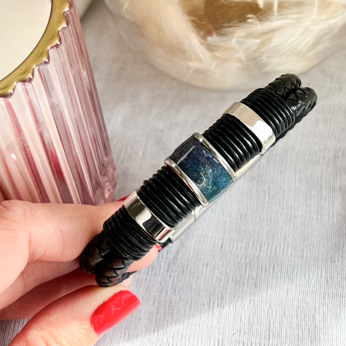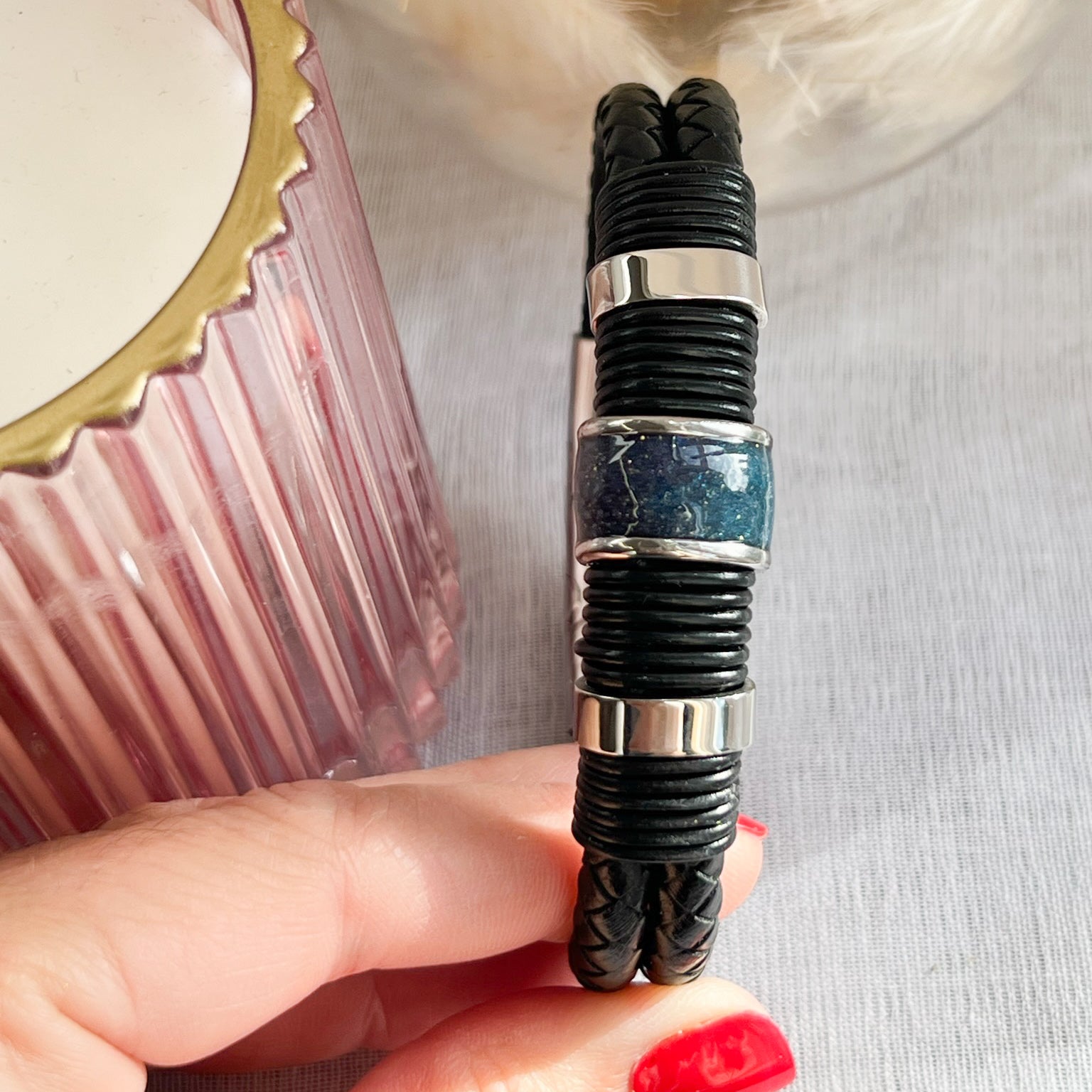 This men's bracelet is made for daily wear and features a durable leather strap and stainless steel clasp. The special bead, made of various materials such as ashes, fur, or hair, adds a unique touch and can serve as a meaningful keepsake. Elevate any outfit with this versatile and sentimental accessory.